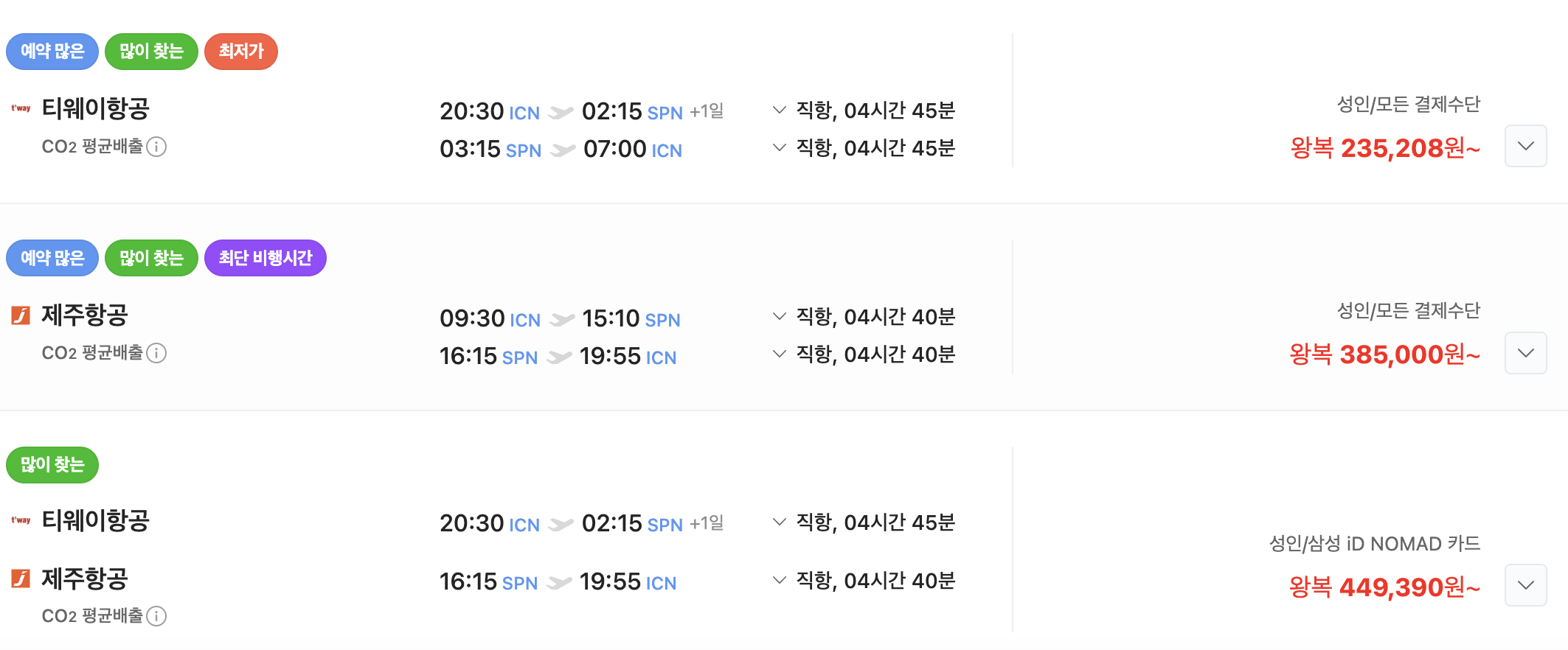 사이판은 인천국제공항(ICN)에서 사이판 국제공항(SPN)으로 직항으로 바로 갈 수 있습니다. 비행 시간은 약 4시간 30분에서 5시간 정도이며, 항공권 가격은 시즌에 따라 다르지만 저가항공사 기준으로 대체로 30만 원에서 40만 원 사이입니다.